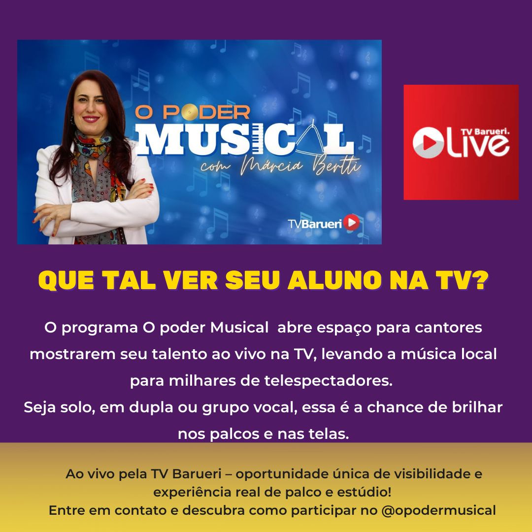 Todas as segundas feiras as 20:00h na TV Barueri em São Paulo, a nossa mestra autora do Método TKT de Violino Márcia Bertti, comanda o programa "O Poder Musical" entrevistando músicos instrumentistas, cantores, bandas, professores e celebridades do meio musical.